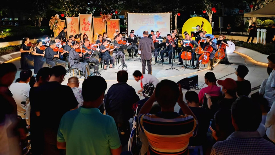 昨晚6时,当一支交响乐队在徐家汇街道的乐山绿地露天奏响《多瑙河之波》《花好月圆》等中外名曲,周围纳凉、散步的居民和走在回家路上的上班族们都被优美的旋律吸引过来,里三层外三层地围成一圈,陶醉在优美的旋律中。轻声哼唱的,拿出手机录像的,打电话召唤邻里赶紧过来欣赏的……居民们都成了这场“双节抱满圆”徐家汇街道“强国复兴有我”国庆中秋文艺展演纳凉晚会的“自来水”。当晚上6时30分到来,绿地里星星点点的月球灯被同时点亮,大家更是不约而同发出了“哇”的惊呼声:“家门口的灯会太漂亮了!”