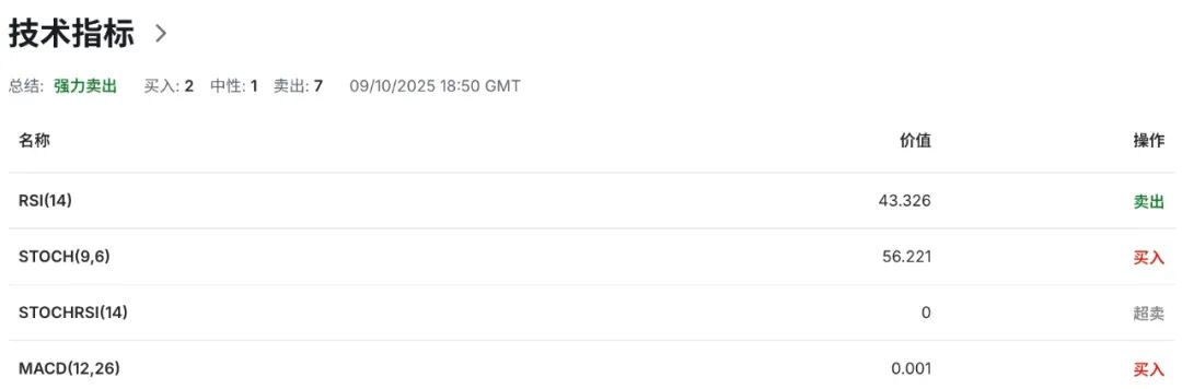动量指标方面,14日相对强弱指标(RSI)已从50水平回落至44的偏弱区间,显示空头动能占据相对优势。这一变化打破了此前多空力量的均衡态势,暗示汇价存在进一步走弱的风险。